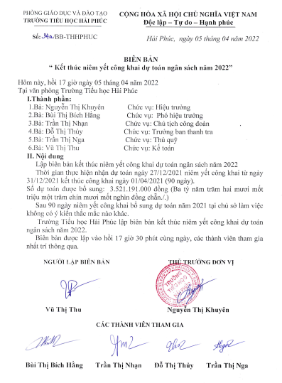 Biên bản Kết thúc niêm yết công khai dự toán ngân sách năm 2022 của trường Tiểu Học Hải Phúc
