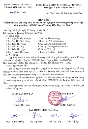 Biên bản Kết thúc niêm yết công khai kế hoạch vận động tài trợ để tăng cường CSVC năm học 2022-2023 của trường Tiểu Học Hải Phúc
