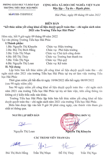 Biên bản kết thúc niêm yết công khai số liệu duyệt quyết toán thu – chi ngân sách năm 2021 của trường Tiểu Học Hải Phúc