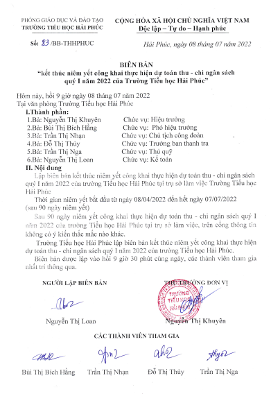 Biên bản kết thúc niêm yết công khai thực hiện dự toán thu – chi ngân sách quý I năm 2022 của trường Tiểu Học Hải Phúc