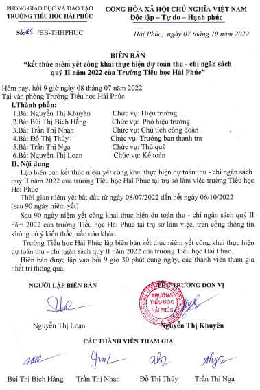 Biên bản kết thúc niêm yết công khai thực hiện dự toán thu – chi ngân sách quý II năm 2022 của trường Tiểu Học Hải Phúc