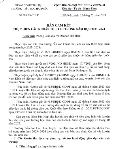 Cam kết thực hiện các khoản thu, chi trong năm học 2023-2024
