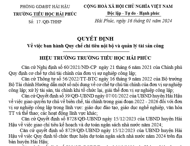Công khai Quy chế chi tiêu nội bộ năm 2024 của trường Tiểu Học Hải Phúc