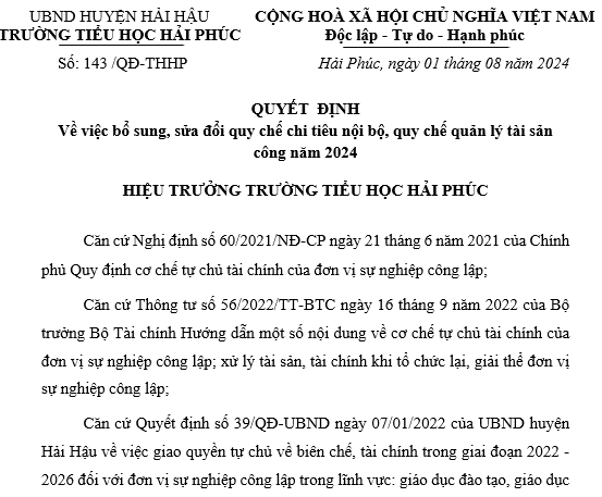 Công khai Quyết định về việc bổ sung, sửa đổi quy chế chi tiêu nội bộ, quy chế quản lý tài sản công năm 2024