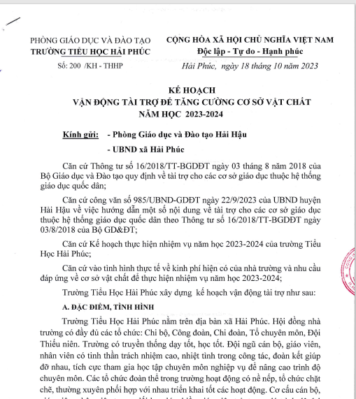 Kế hoạch vận động tài trợ để tăng cường cơ sở vật chất năm học 2023-2024