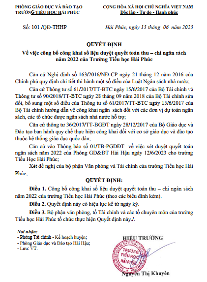 Quyết định công khai số liệu duyệt quyết toán thu – chi ngân sách năm 2022 của Trường TH Hải Phúc