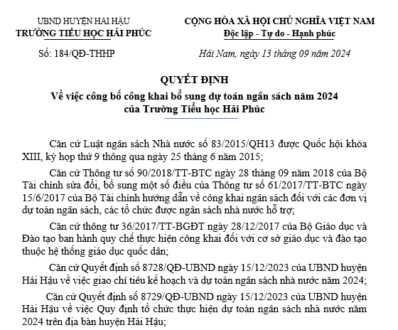 Quyết định Về việc công bố công khai bổ sung dự toán ngân sách năm 2024 của Trường Tiểu học Hải Phúc (Căn cứ theo QĐ số 566/QĐ-PGDĐT ngày 10/09/2024 của Phòng GD&ĐT Hải Hậu), , ,