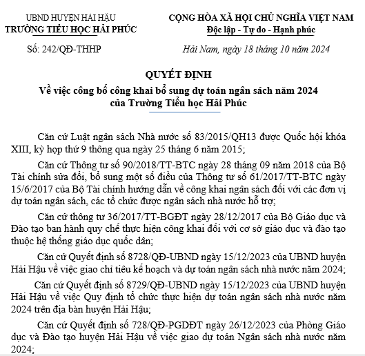 Quyết định Về việc công bố công khai bổ sung dự toán ngân sách năm 2024 của Trường Tiểu học Hải Phúc (Căn cứ theo QĐ số 679/QĐ-PGDĐT ngày 16/10/2024 của Phòng GD&ĐT Hải Hậu)