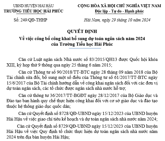 Quyết định Về việc công bố công khai bổ sung dự toán ngân sách năm 2024 của Trường Tiểu học Hải Phúc (Căn cứ theo QĐ số 703/QĐ-PGDĐT ngày 25/10/2024 của Phòng GD&ĐT Hải Hậu), , ,
