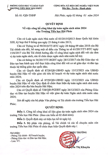 Quyết định Về việc công bố công khai dự toán ngân sách năm 2024 của Trường Tiểu học Hải Phúc,