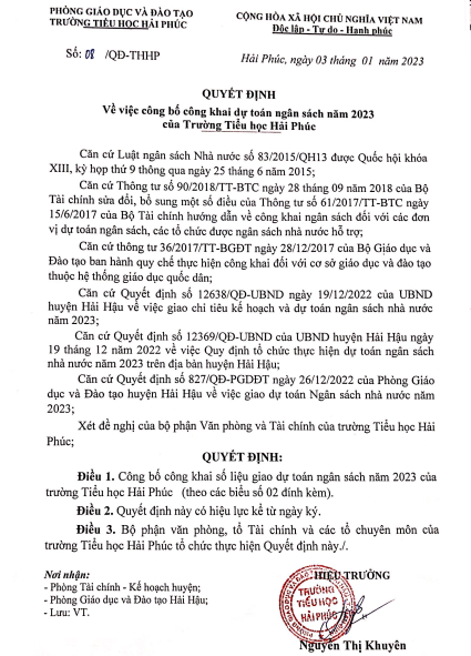 Quyết định về việc công bố công khai giao dự toán ngân sách năm 2023 của Trường Tiếu Học Hải Phúc