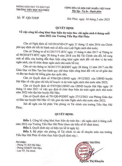 Quyết định về việc công bố công khai thực hiện dự toán thu chi ngân sách 6 tháng cuối năm 2022 của Trường Tiếu Học Hải Phúc