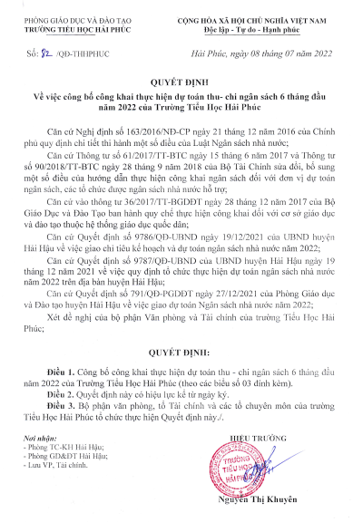Quyết định về việc công bố công khai thực hiện dự toán thu chi ngân sách 6 tháng đầu năm 2022 của Trường Tiếu Học Hải Phúc