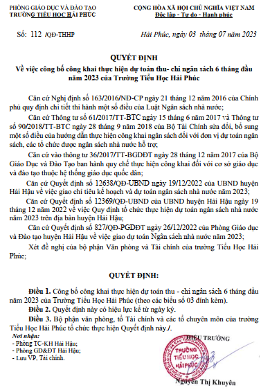 Quyết định Về việc công bố công khai thực hiện dự toán thu- chi ngân sách 6 tháng đầu năm 2023 của Trường Tiểu Học Hải Phúc