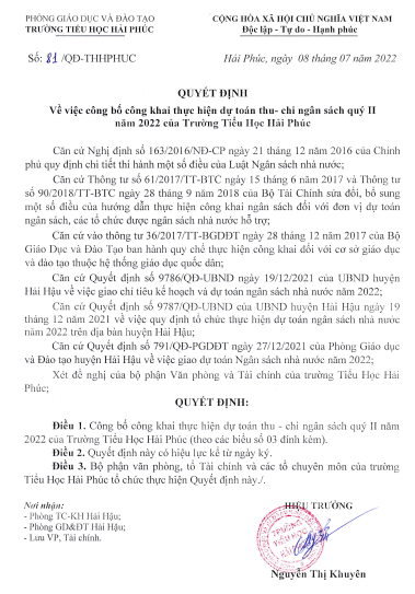 Quyết định về việc công bố công khai thực hiện dự toán thu chi ngân sách quý II năm 2022 của Trường Tiếu Học Hải Phúc