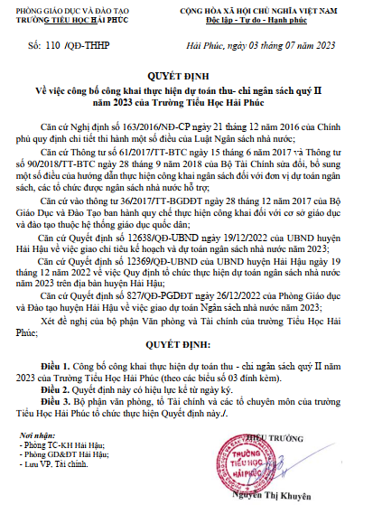 Quyết định Về việc công bố công khai thực hiện dự toán thu- chi ngân sách quý II năm 2023 của Trường Tiểu Học Hải Phúc