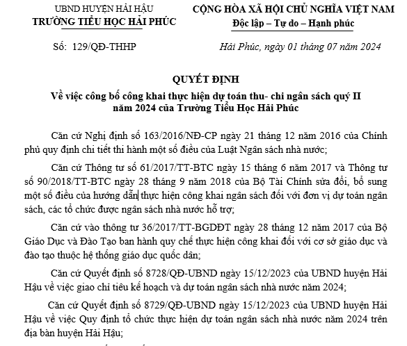 Quyết định Về việc công bố công khai thực hiện dự toán thu- chi ngân sách quý II năm 2024 của Trường Tiểu Học Hải Phúc,