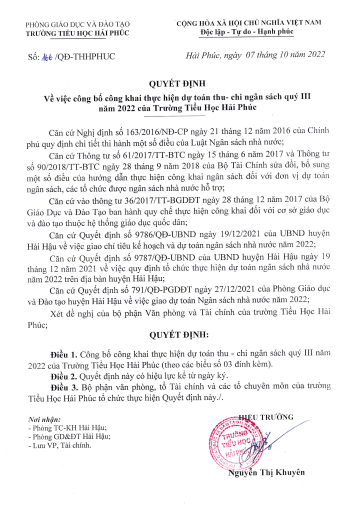 Quyết dịnh về việc công bố công khai thực hiện dự toán thu- chi ngân sách quý III năm 2022 của Trường Tiểu Học Hải Phúc