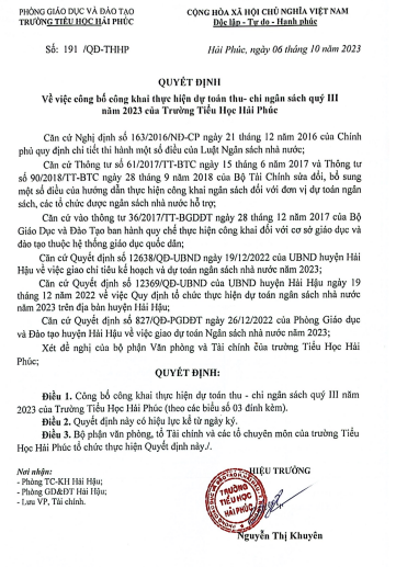 Quyết định Về việc công bố công khai thực hiện dự toán thu- chi ngân sách quý III năm 2023 của Trường Tiểu Học Hải Phúc