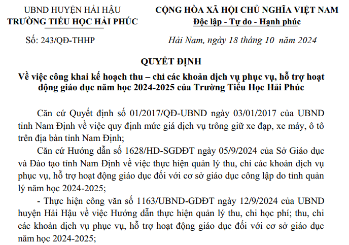 Quyết định về việc công khai kế hoạch thu – chi các khoản dịch vụ phục vụ, hỗ trợ hoạt động giáo dục của nhà trường năm học 2024-2025